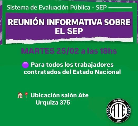 El próximo martes 25 de febrero a las 18hs, la ATE llevará a cabo una reunión informativa en el SUM de Urquiza 375, destinada a todos los trabajadores nacionales contratados que, luego del mes de marzo, deberán rendir el Sistema de Evaluación Pública (SEP).