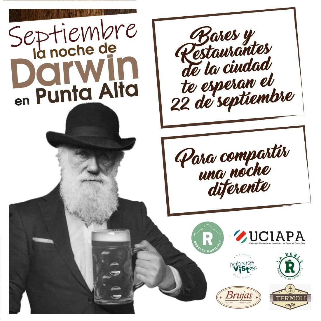 Al conmemorarse este jueves 22 de septiembre el 190° aniversario de la llegada de Charles Darwin a nuestras costas, en forma conjunta entre la UCIAPA y Rosales Municipio, a través de las distintas dependencias de la Secretaría de Coordinación y Gestión, se celebrará “La noche de Darwin en Punta Alta”.