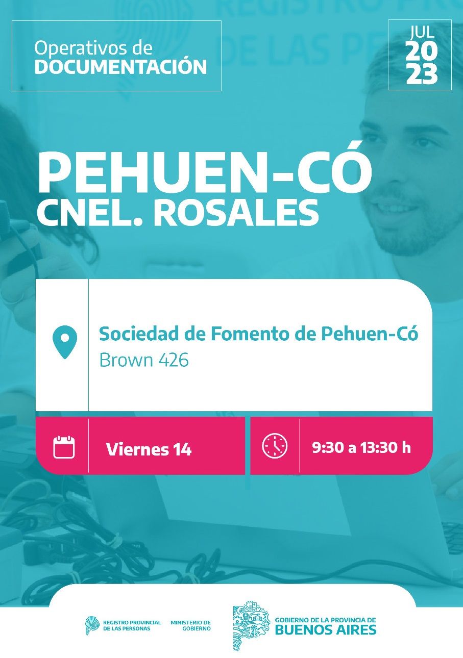 Este viernes 14 de julio, de 9:30 a 13:30 hs en la Sociedad de Fomento Amigos de PehuenCo, se estará realizando un operativo de documentación a cargo del Registro Provincial de las personas.
