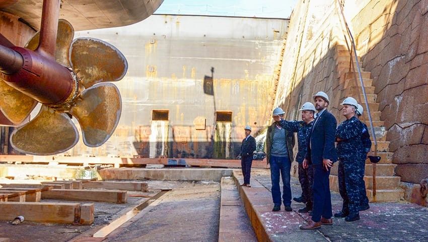También recorrieron los diques N° 1 y N° 2 del ARPB para conocer las tareas que se realizan actualmente sobre los distintos buques y los trabajos que particularmente se están llevando a cabo en el Destructor ARA “Sarandí”.