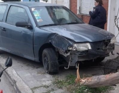 El conductor del auto, dominio DGQ 491, color azul, realizó una mala maniobra, derribando un árbol y canasto de residuos, terminando su recorrido arriba de la vereda.