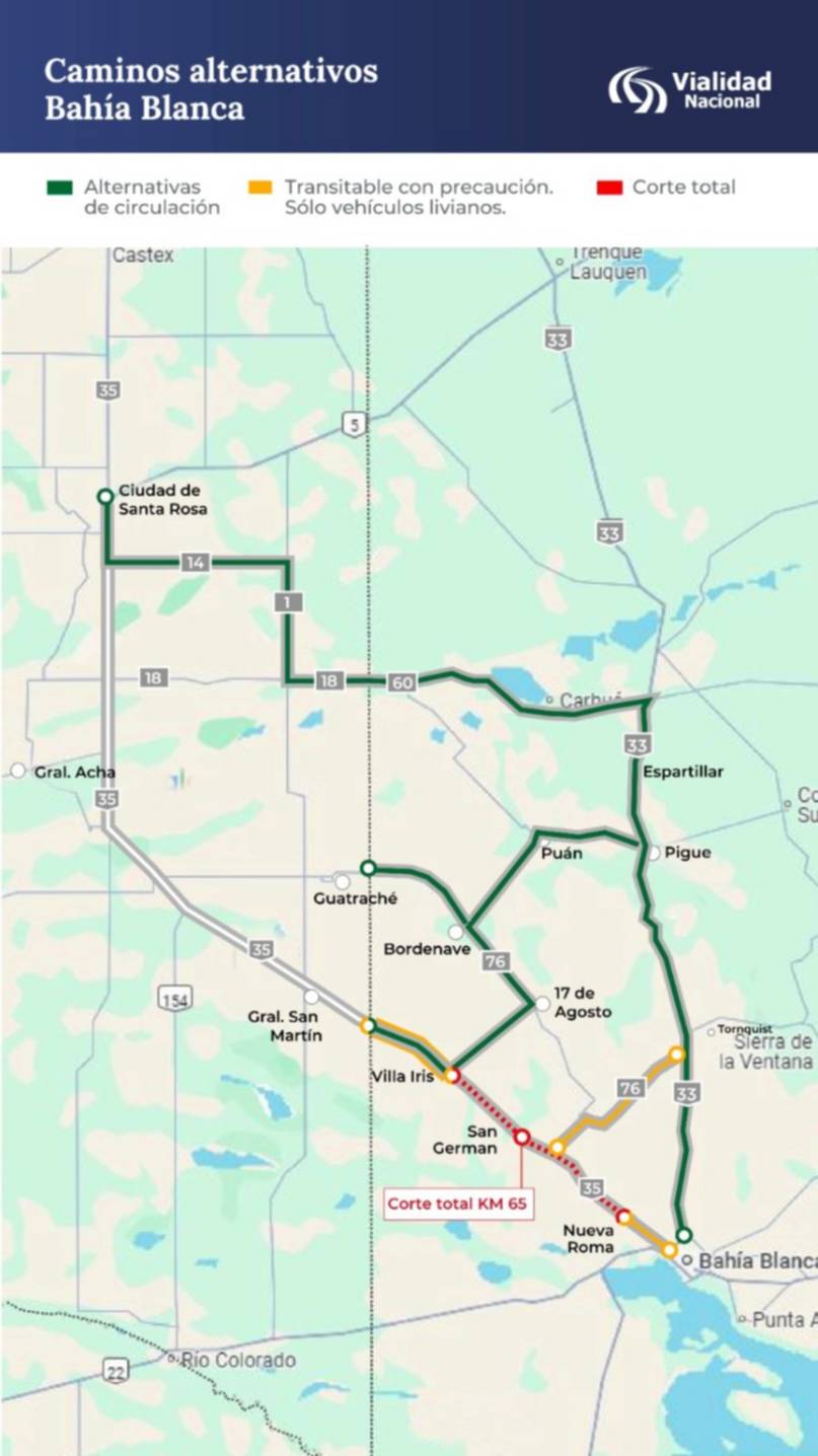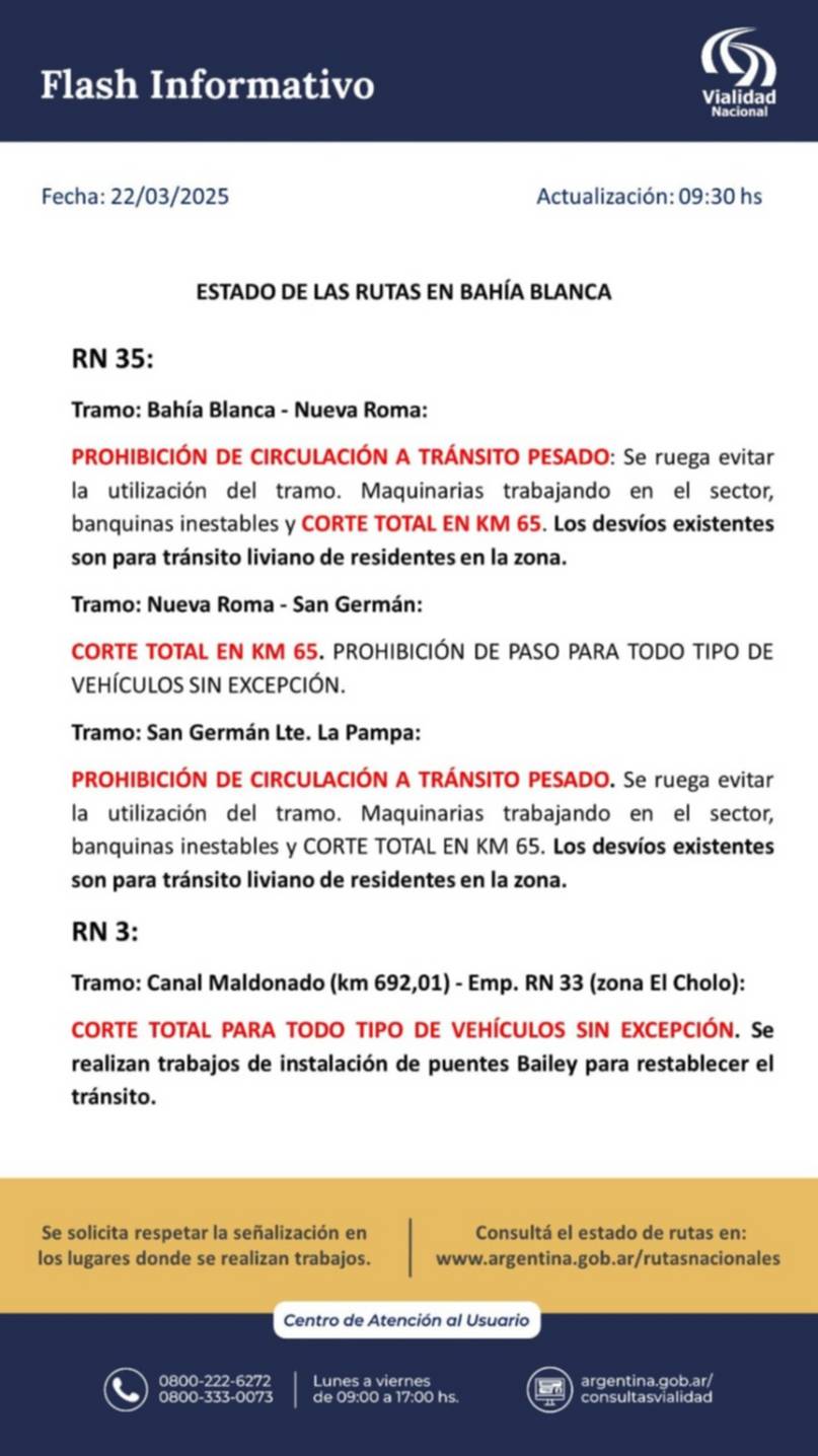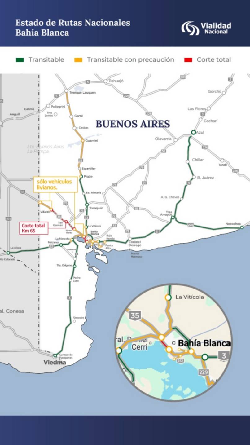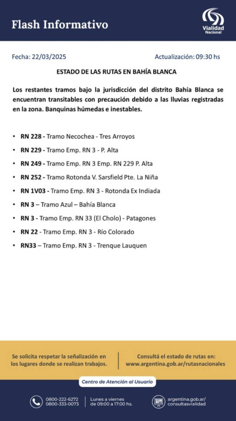 Vialidad Nacional actualizó el estado de las rutas bajo su jurisdicción en el distrito de Bahía Blanca tras las lluvias registrada durante la madrugada de ayer.