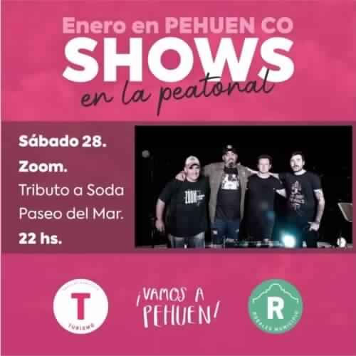 Desde la Dirección de Turismo, dependiente de la Secretaría de Coordinación y Gestión de Rosales Municipio, se invita a turistas y visitantes de Pehuen Co a las diferentes propuestas para este fin de semana. Se destaca la presentación del grupo Zoom, tributo a Soda Stereo, el sábado a las 22hs.