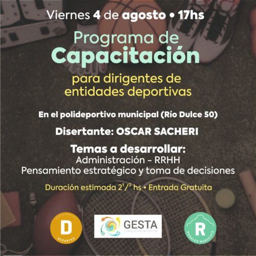 Este viernes 4 de agosto, desde las 17hs, se llevará a cabo una capacitación para dirigentes de entidades deportivas. Será totalmente gratuita, en el Polideportivo Municipal de Río Dulce 50.