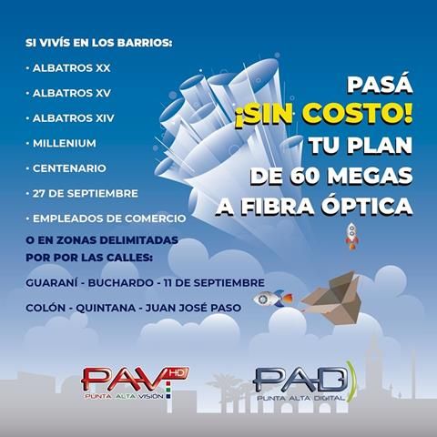 Punta Alta Visión informa a sus clientes que aquellos que tengan su plan de 60 Megas se pueden pasar sin costo a Fibra Óptica.
