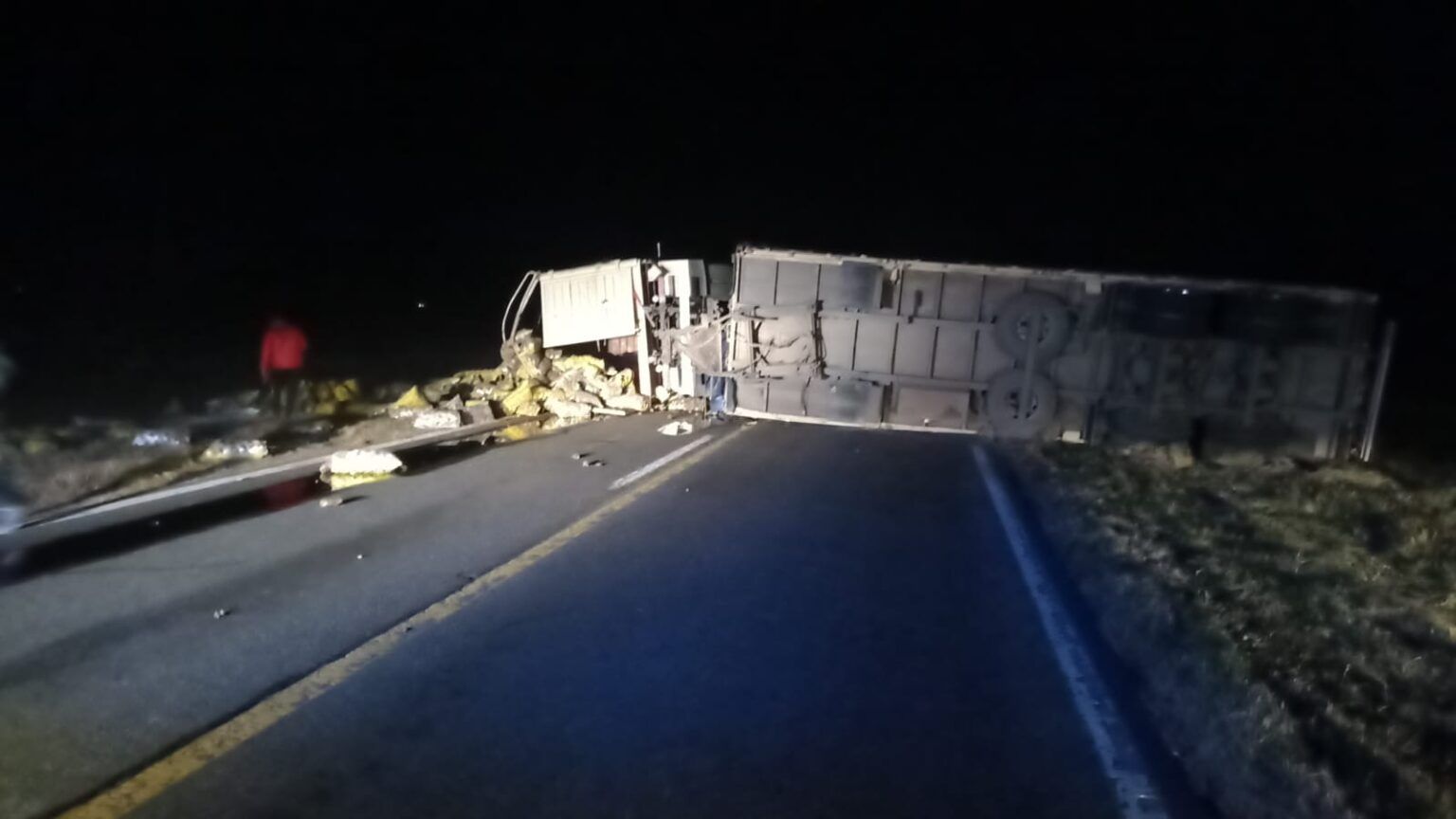 El siniestro ocurrió cerca de las 22:30 hs. La ruta se encuentra parcialmente cortada debido a que esperan por una grúa de mayor porte para levantar el acoplado que quedó en medio de la calzada y perdió la carga que son toneladas de papas.