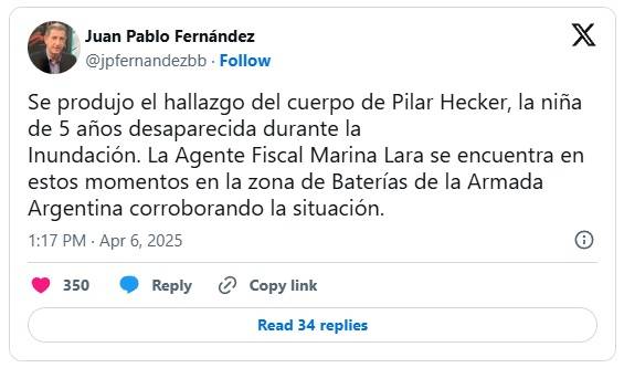 A través de sus redes sociales, Fernández informó que "se produjo el hallazgo del cuerpo de Pilar Hecker, la niña de 5 años desaparecida durante la