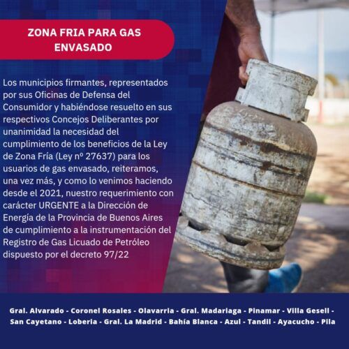Es por ello que, en conjunto con los municipios de Lobería, General Alvarado, Olavarría, General Madariaga, Pinamar, Villa Gesell, San Cayetano, General Lamadrid, Bahía Blanca, Tandil, Ayacucho, Azul y Pila, representados por sus Oficinas de Defensa del Consumidor, se reclama que los usuarios de gas envasado puedan acceder a los beneficios de Zona Fría, como ya lo están haciendo los usuarios de gas natural por red.