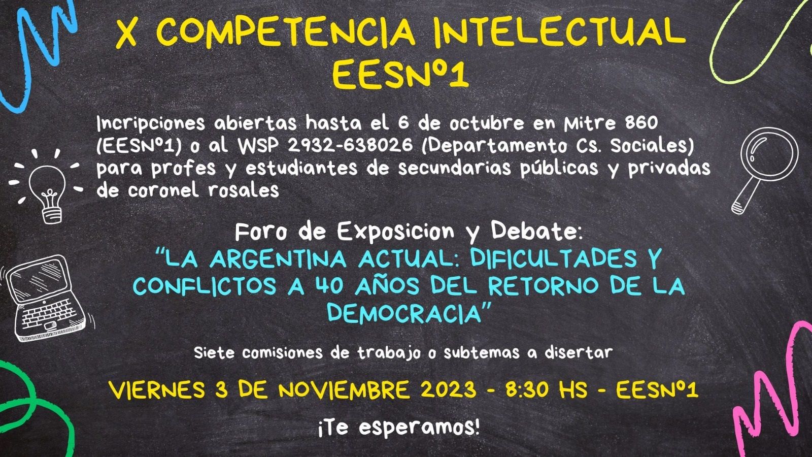 Inscripciones abiertas hasta el 6 de Octubre en Mitre 860 (EESN1) o por Wsp 2932 638026 (Dpto de Cs Sociales).
